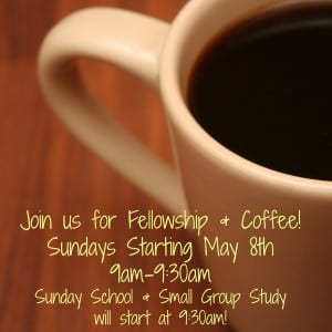 Fellowship & Coffee March 17, 2025 by Jessica Wilson May 8, 2016Repeats weekly 7 timesFellowship & Coffee9:00 am - 9:30 amJoin us for Fellowship, Coffee & Pastries before heading to Sunday School! Community Event